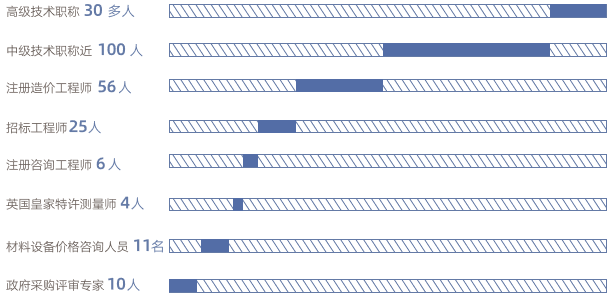 公司注重一流專業(yè)技術(shù)團(tuán)隊(duì)建設(shè),經(jīng)過多年的努力,組建成一支結(jié)構(gòu)合理、敬業(yè)守責(zé)、充滿活力,高水平的專業(yè)技術(shù)團(tuán)隊(duì)?,F(xiàn)有專業(yè)技術(shù)人員400余名,其中高級(jí)技術(shù)職稱30多人,中級(jí)技術(shù)職稱近100人,注冊造價(jià)工程師56人,招標(biāo)工程師25人,注冊咨詢工程師6人,英國皇家特許測量師4人,材料設(shè)備價(jià)格咨詢?nèi)藛T11名,政府采購評(píng)審專家10人。這些專業(yè)素質(zhì)人才在自己崗位上均有著深厚的理論基礎(chǔ)和豐富的實(shí)踐經(jīng)驗(yàn),是各類咨詢服務(wù)質(zhì)量的根本保證。